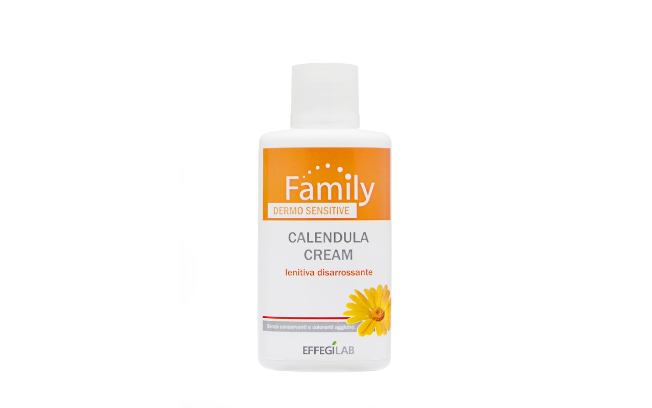 Calendula cream FAMILY DERMO SENSITIVE calma gli arrossamenti, lenisce e fortifica l’epidermide. Arricchita di olio di Calendula, vitamina E ed estratti vegetali emollienti ripara e ristruttura la pelle lasciandola liscia e morbida. Usata quotidianamente protegge all’inquinamento, previene la disidratazione e la comparsa di arrossamenti tipici delle pelli sensibili.